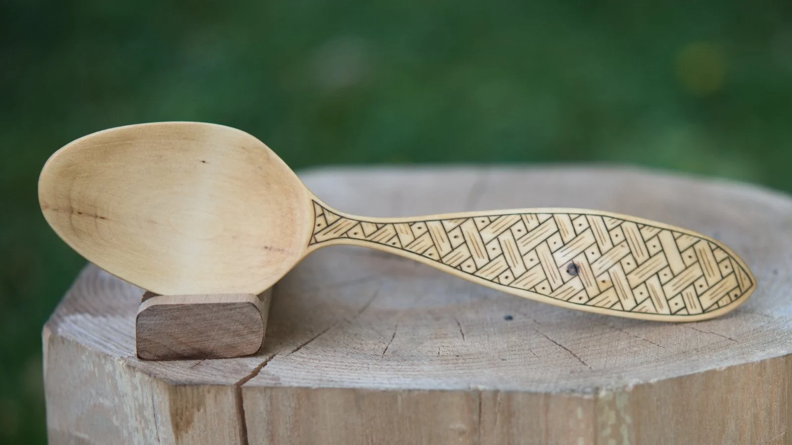 Cuillère à manger en érable avec gravure de type kolrosing, au café.